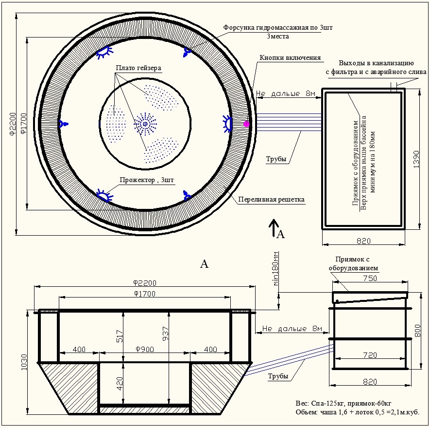- Размеры чаши: внешние Ф2,2х1м; внутренние Ф1,7х1м;