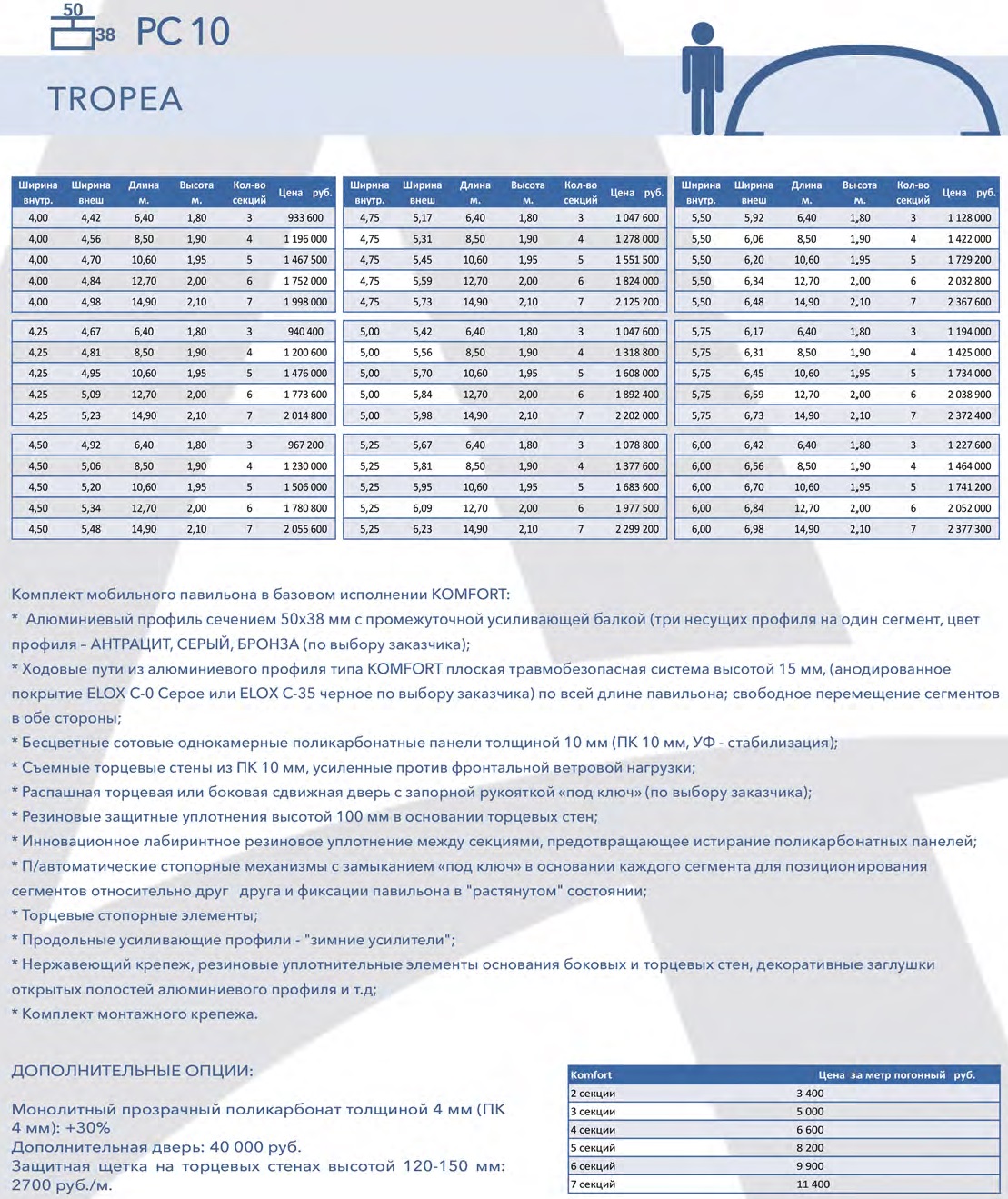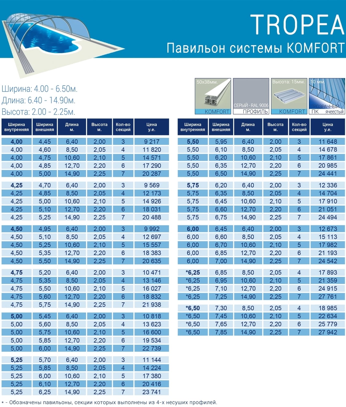 Павильон для бассейна Тропея ( Tropea ) – является высоким павильоном. По размерам он находится где-то между высокой моделью «Laguna» и средним укрытием «Universe». Так что при желании под этим павильоном можно свободно ходить. Эта модель предназначена для свободного перемещения по всей укрываемой площади обходных дорожек плавательного бассейна. Благодаря одинаковой высоте в свету по всей площади, павильон ничем не ограничивает передвижение людей в закрытом помещении вокруг бассейна. С применением продолженных ходовых путей весь павильон можно сдвинуть за периметр бассейна таким образом, что сегменты образуют защищенный от ветра навес, где можно расположить зону отдыха.