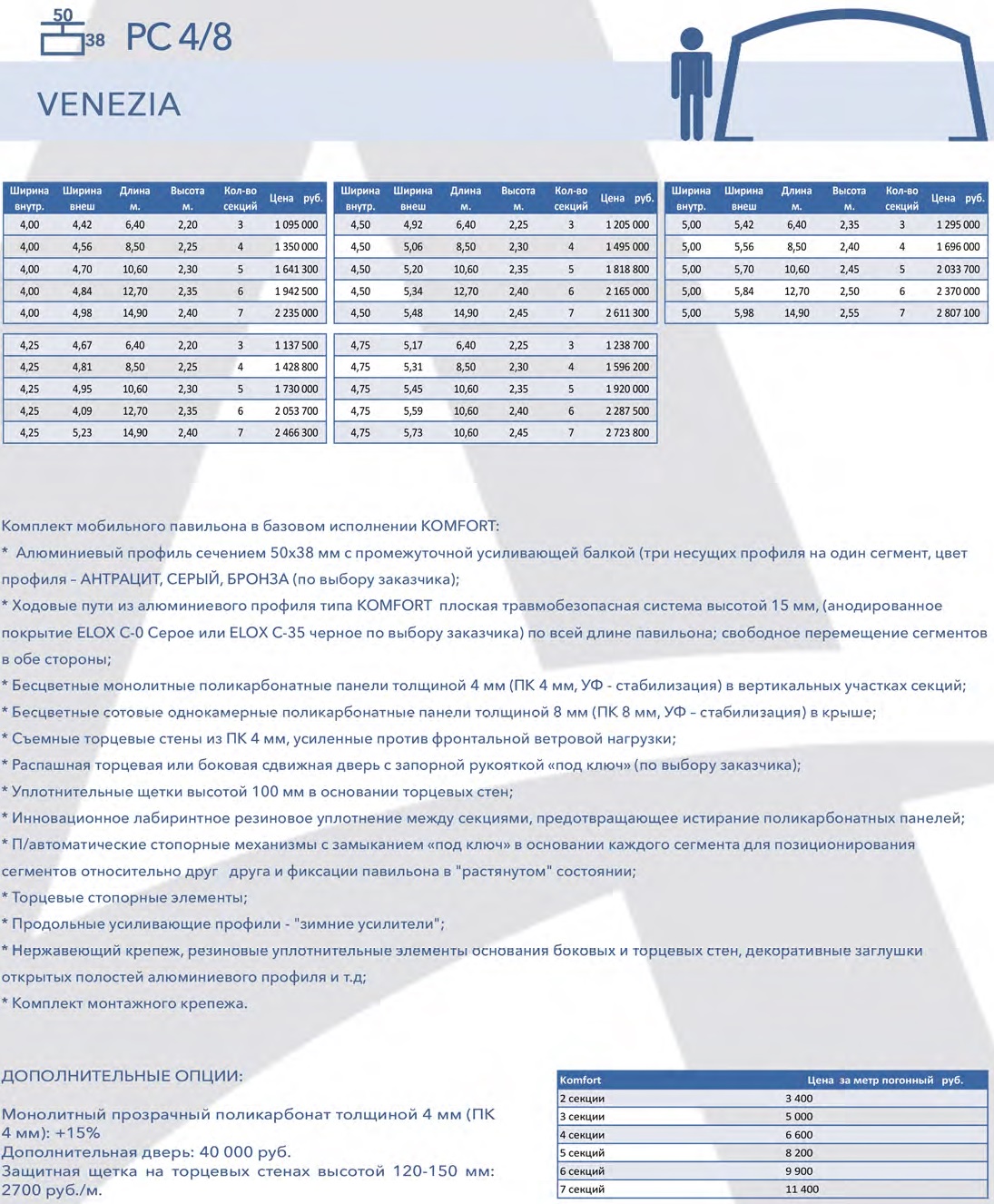 Павильон для бассейна Венеция ( Venezia ) – является очень просторным павильоном. Благодаря почти вертикальным стенкам, можно легко перемещаться внутри павильона по обе стороны от Вашего бассейна. Многоцелевой высокий павильон ВЕНЕЦИЯ представляет собой комбинацию дугообразной крыши и двух вертикальных продольных стенок, позволяющих использовать пространство всех четырех обходных дорожек вокруг плавательного бассейна. Павильон создает над бассейном просторное складное помещение, которое может быть телескопически собрано и передвинуто за периметр бассейна.
