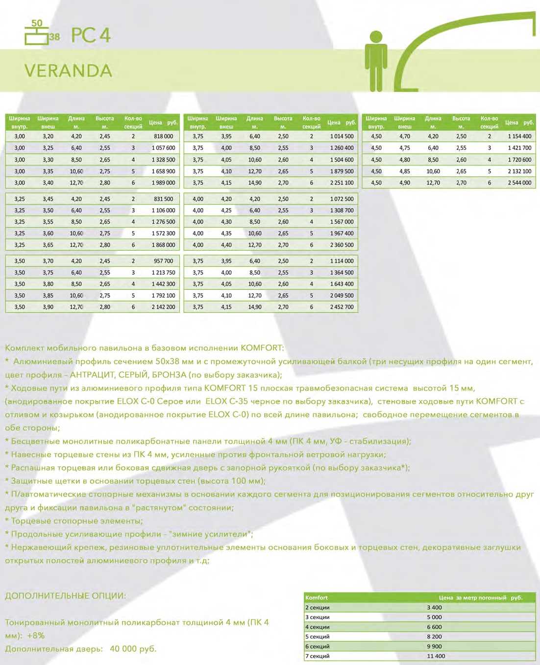 Павильон для бассейна Веранда ( Veranda ) – этот павильон предназначен для укрытия зоны бассейна, СПА и гидромассажной ванны, которые расположены непосредственно рядом с домом. Сегменты павильона для бассейна ВЕРАНДЫ телескопически перемещаются вдоль по ходовым путям, прикрепленным к вертикальной стене дома и к верху пред-домовой площадки. Павильон расширяет жилое пространство дома. Конструкцию можно легко приспособить к различным формам закрываемых пространств, разной высоте подоконников, ограждений и примыканий к стене. Достоинством системы является возможность широко раскрыть павильон в хорошую погоду. Применение легких, но прочных и устойчивых материалов, системы подвижных сегментов, скользящих по плоским ходовым путям, упрощает открытие или полное закрытие павильона для бассейна.